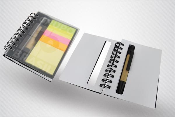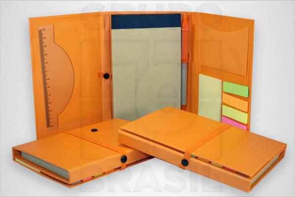 Bloco de anotações e caneta ecológicos, calculadora solar e post-it colorido. Contém aproximadamente 55 folhas - uma gravação em uma cor já incluso.