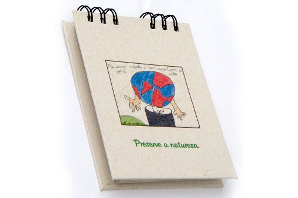Blocos ecológico, capa dura, revestida em papel reciclado 120gr, impressão 4 cores, miolo com 100 folhas em papel reciclado 75gr, impressão 1x0 cor, layout...