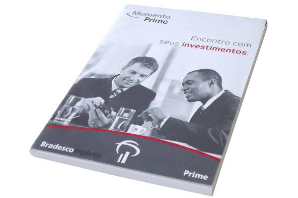 Bloco capa dura revestida em papel couchê 150gr, impressão 4 cores, miolo com 200 folhas em papel off-set 75gr, impressão 1x0 cor, lombada quadrada, medida...
