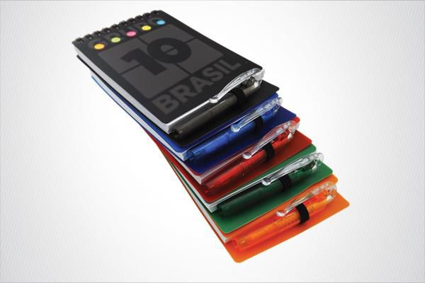 Bloco de Anotações com Porta-Caneta, capa em papel triplex 300gr, impressão digital até 3 cores, medida: 9,5x14cm, acabamento: laminação, faca e corte/vinc...