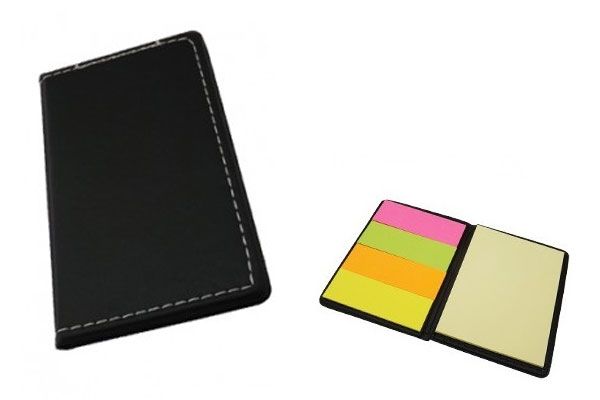Bloco de anotações com post-it e mini caneta, material de plástico.