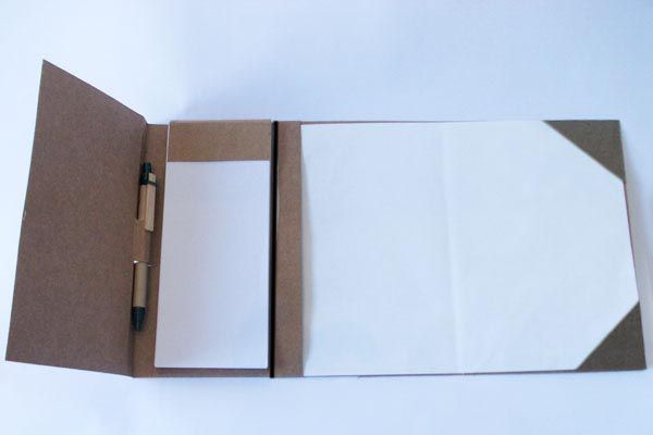 Pastas Diplomata Kraft - ... Pasta diplomata em papel kraft 420gr, impressão em silk em 1 cor, bloco com 25 folhas em papel reciclado 75gr, fechamento com velcro, acabamento: faca, cor...