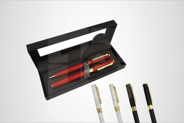 Kit Caneta e Lapiseira - ... Kit comm caneta e lapiseira de metal brilhante em estojo de papel resistente. Uma gravação já inclusa.