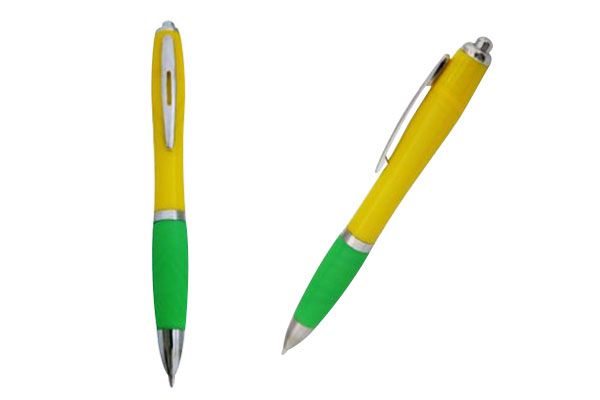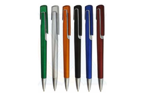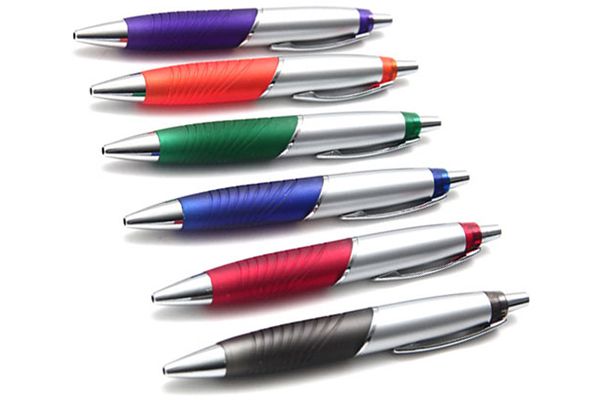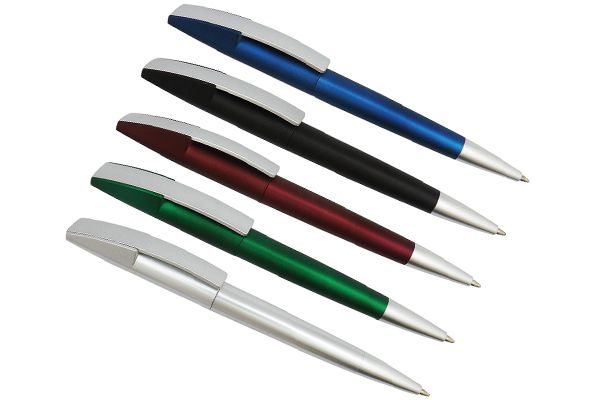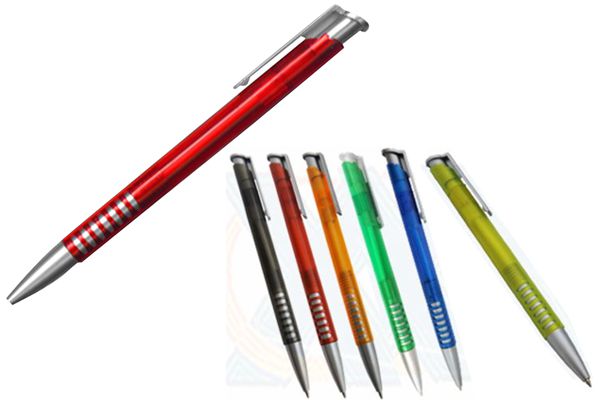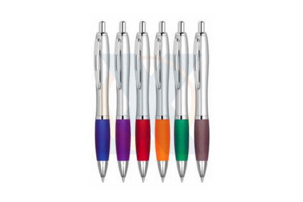 Caneta plástica inteira colorida com detalhes prata. Clip metal, basta pressionar o clip para acionar a esferográfica. Gravação em 1 cor já incluso.