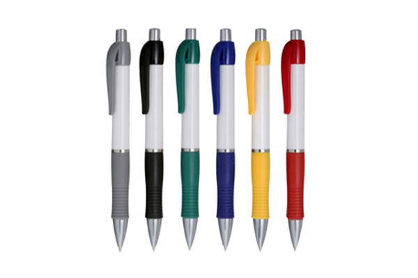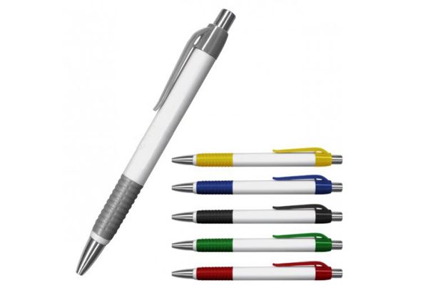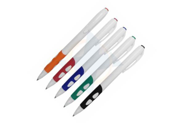 Caneta de plástica, corpo branco, com detalhe emborrachado, disponível nas cores: laranja, vermelha, azul, verde e preta. Gravação em 1 cor já incluso.