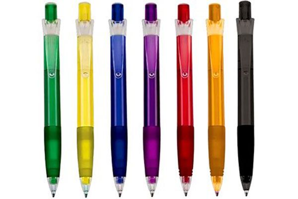 Caneta de plástica, corpo colorido, com apoio emborrachado, disponível nas cores: laranja, amarela, vermelha, roxa, azul, verde e preta. Gravação em 1 cor ...