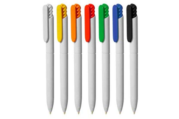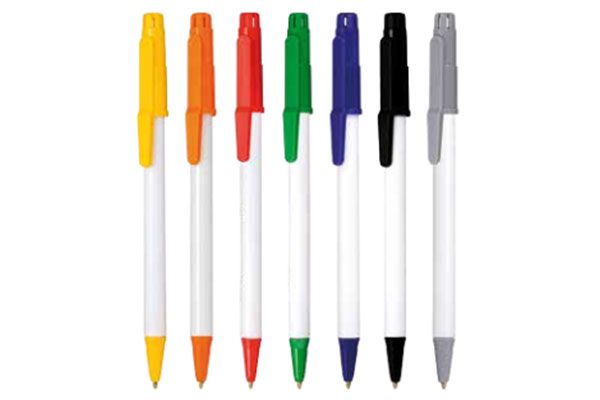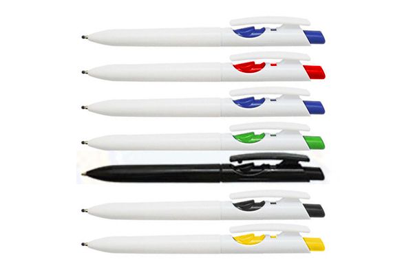 Caneta plástica personalizada, corpo branco, clips nas cores: preto, amarelo, laranja, vermelho, branco, verde e azul, gravação em 1 cor já incluso.