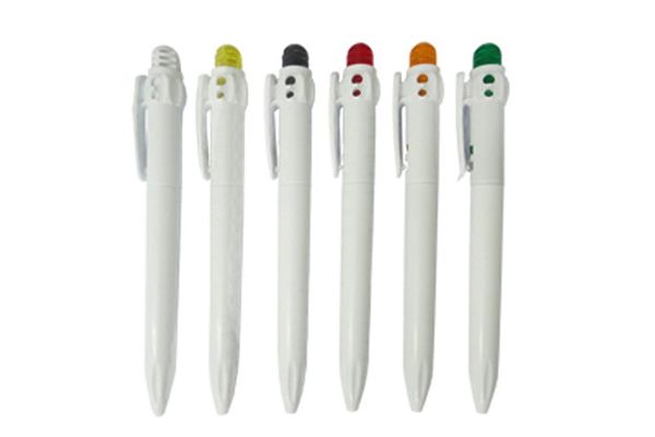 Caneta importada, corpo plástico branco, apoio, ponta e clipe nas cores azul, preto, vermelho, amarelo e verde. Gravação por tampografia com 01 cor já incl...