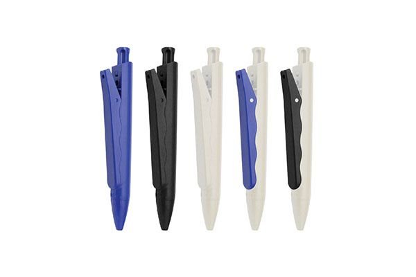 Caneta de plástico com clip prata.