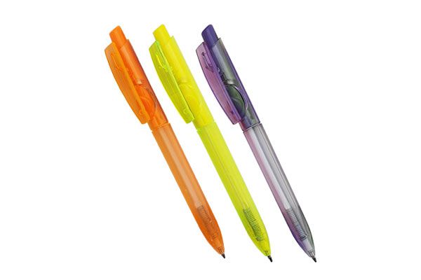 Caneta esferográfica com marca texto em cores marcantes. Gravação em 1 cor já incluso.
