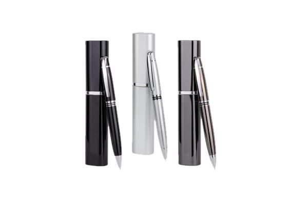 Caneta metálica importada, esfero, corpo em metal prata fosca e detalhes cromados. Gravação a laser. Acompanha embalagem em veludo preto.