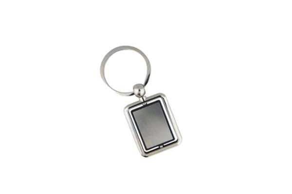 Chaveiro de Metal Giratór... Chaveiro de metal giratório, com detalhe em prata escovado nas duas faces, formato retangular - tamanho: Corpo (CxL) 4,8 cm x 3,0 cm