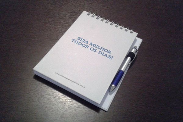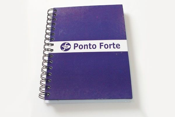 Cadernos promocional A-5, capa dura, revestida em papel couchê 150gr, impressão off-set 1 cor, acabamento capa/contra-capa: laminação brilho e empastamento...