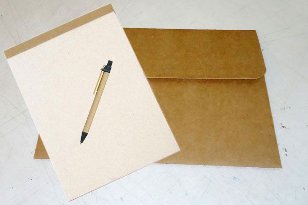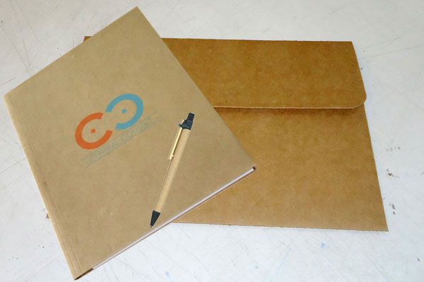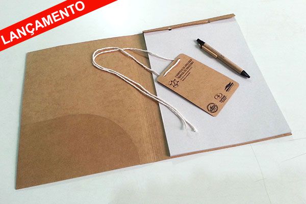 Pasta confeccionada em kraft 400gr, com alças e fecho com elástico. Acompanha 1 bloco em 25 fls de papel reciclado e 1 caneta ecológica de papelão. Incluso...
