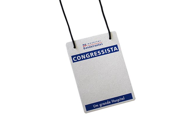 Crachá personalizado com cordão, confeccionado em papel triplex 300gr, impressão em silk 1 cor já incluso, medidas: 9x14cm.