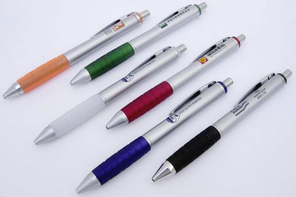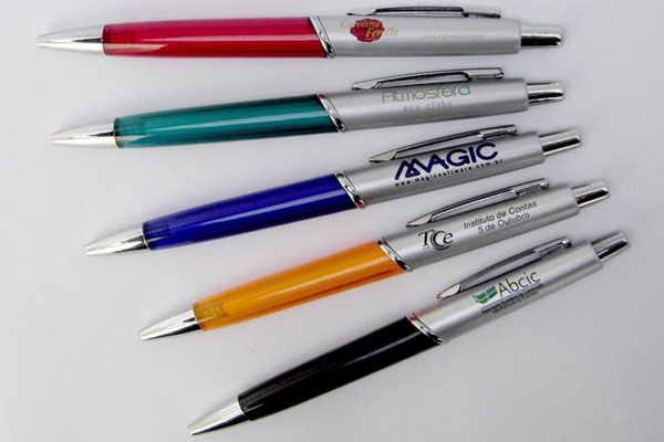 Caneta importada, esfero, clipe cromado, corpo plástico prata e acrílico nas cores: azul, vermelha, preta, branca, verde e laranja. Gravação por tampografi...