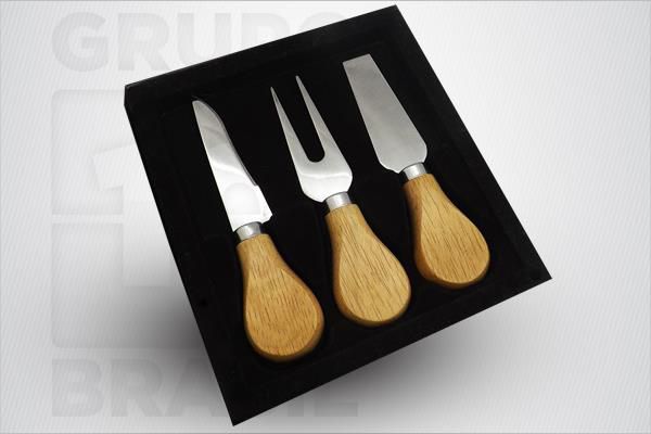 Kit para queijo com 3 peças, em estojo de papelão resistente com tampa de plástico.