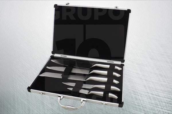 Jogo de facas com 5 peças, material em metal, acompanha maleta para transporte.