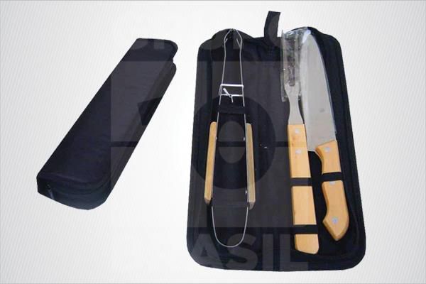 Kit churrasco com 2 peças, detalhe no cabo em madeira. Acompanha estojo para transporte, material em nylon.