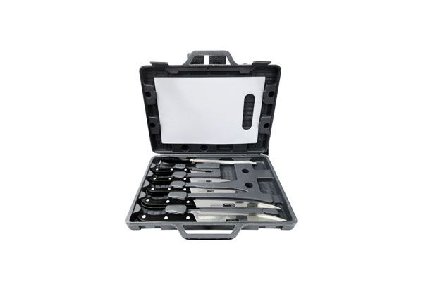Kit Churrasco com 5 peças e tabua, em estojo sintético.