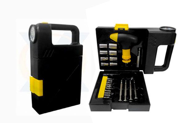 Kit ferramenta com 24 peças e lanterna na caixa.