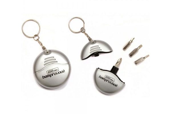 Chaveiro kit ferramenta com 4 peças, material plástico resistente - tamanho total 6,0 cm - com uma gravação já nclusa.