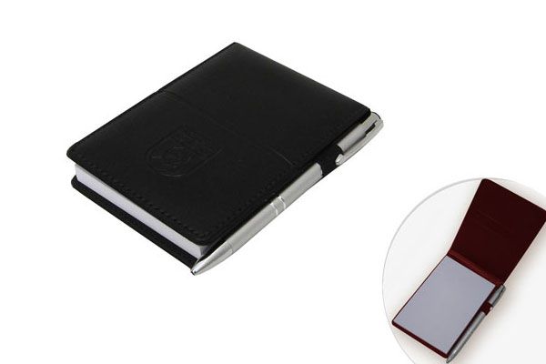 Porta bloco com lingueta e porta caneta. Produzido em couro sintético uma gravação já inclusa.