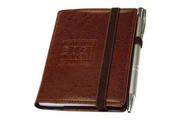 Bloco de bolso em couro sintético, tamanho do bloco 8,5x12cm com espaço para caneta e personalização da logomarca em baixo relevo. (Caneta opcional).