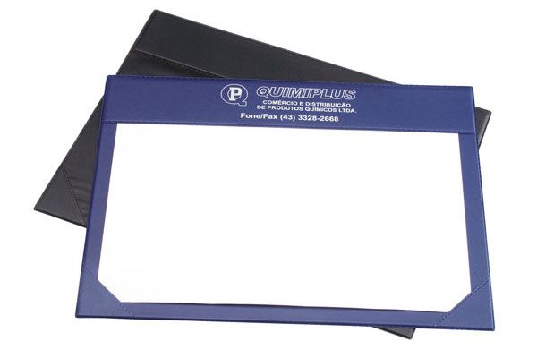 Risque-rabisque básico A-4, confeccionado em papelão rígido com revestimento em couro sintético. Gravação em baixo relevo ou silk.